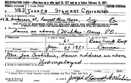 Joseph Stewart Casterline World War II Selective Service Registration