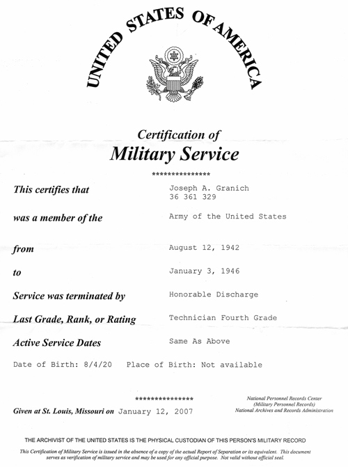 Joseph Granich Certification of Military Service