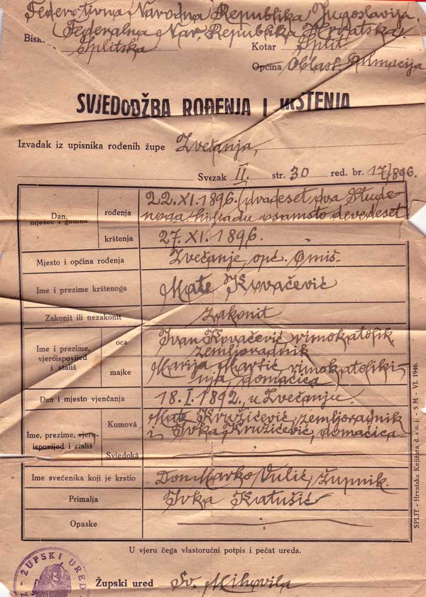 Mate Kovačević Birth & Baptism Certificate - November 1896